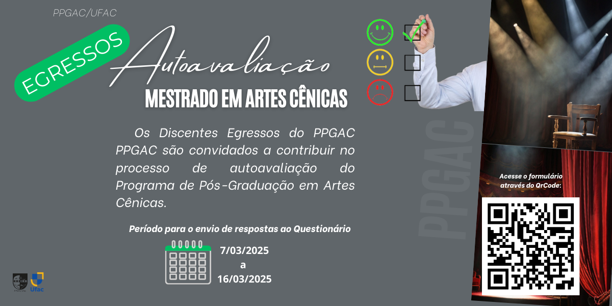Prezados(as) egresso(as) do Programa de Pós-graduação em Artes Cênicas (PPGAC) da Universidade Federal do Acre, titulados a partir de 2022, gostaríamos de contar com a valiosa contribuição de todos vocês, nossos egressos, para a realização de um processo de autoavaliação. Este processo é fundamental...