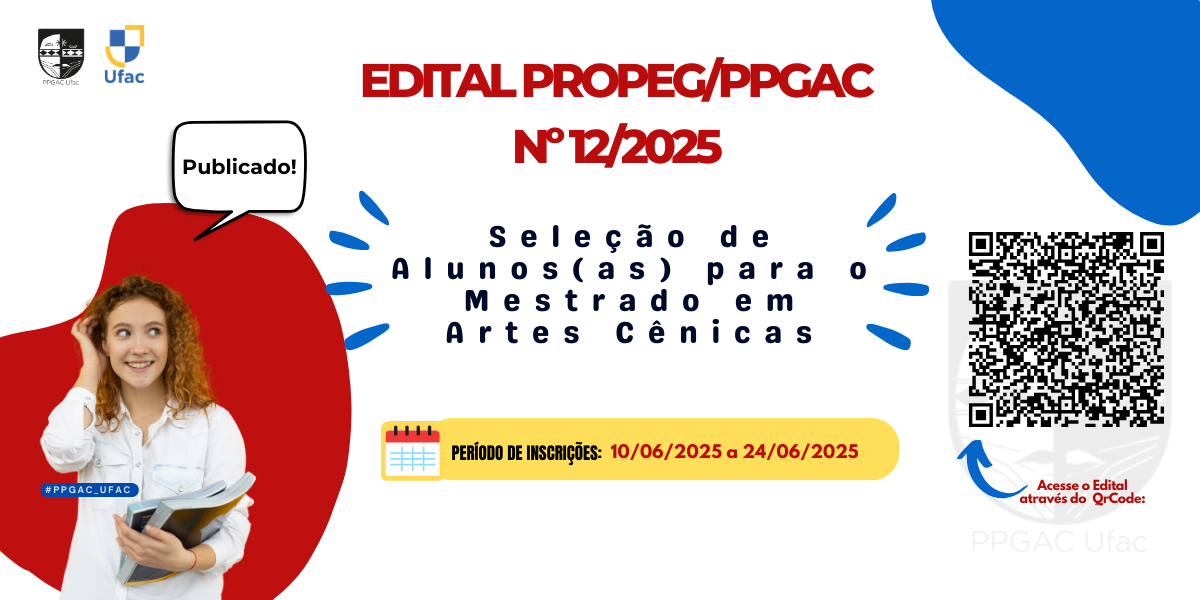 Fonte da imagem: Anuário Universidade Federal do Acre. A Coordenação do Programa de Pós-Graduação em Artes Cênicas (PPGAC) – Mestrado Acadêmico em Artes Cênicas, da Universidade Federal do Acre, informa que publicou no último dia 29 de novembro de 2024, Edital PPGAC N.º 02/2024 para Credenciamento...