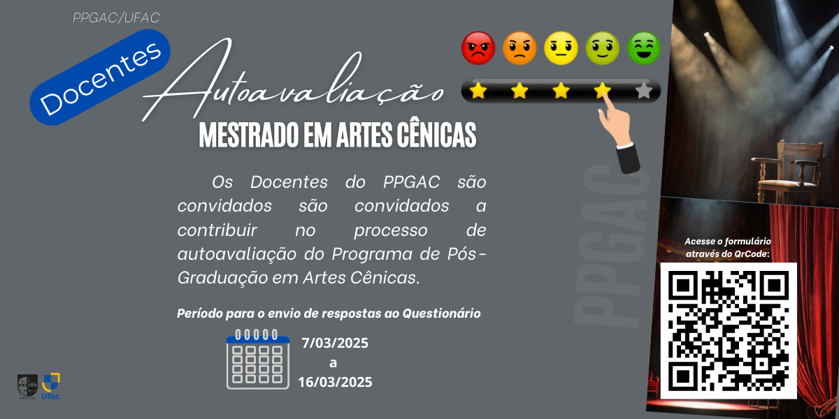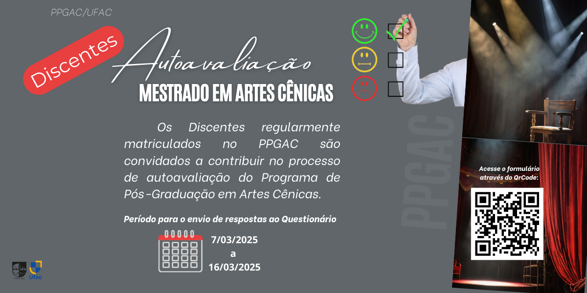 Prezados(as) discentes do Programa de Pós-graduação em Artes Cênicas (PPGAC) da Universidade Federal do Acre, gostaríamos de contar com a valiosa contribuição de todos/as vocês, nossos/as discentes com matrícula ativa (turmas 2023/2 e 2024/2), para a realização de um processo de autoavaliação. Este processo...